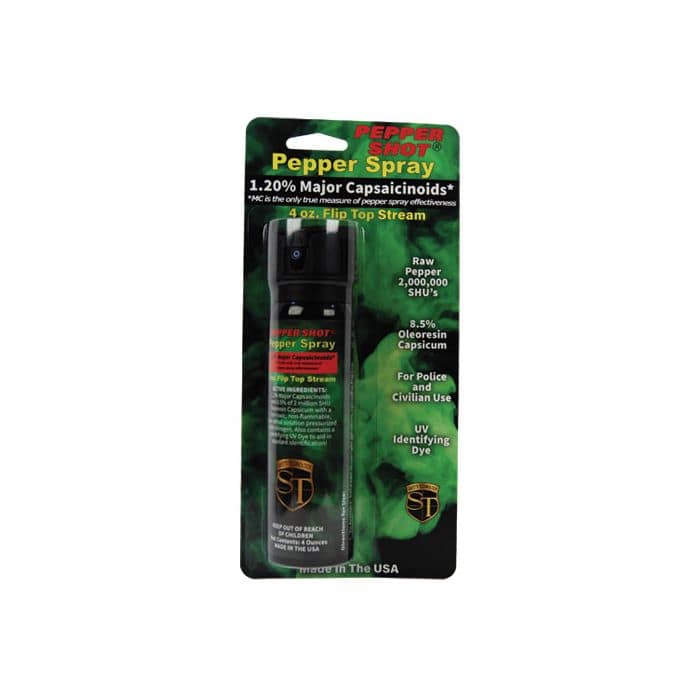 1.2% MC Pepper Shot Stream Pepper Spray is available in a 2 oz flip top stream pepper spray, 2 oz stream pepper spray (no flip top), 4 oz flip top stream pepper spray, and 4 oz stream pepper spray (no flip top)