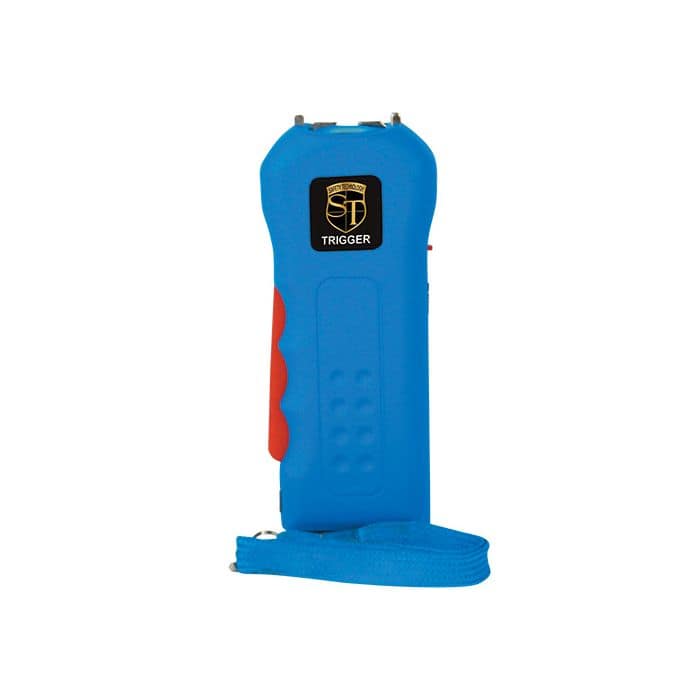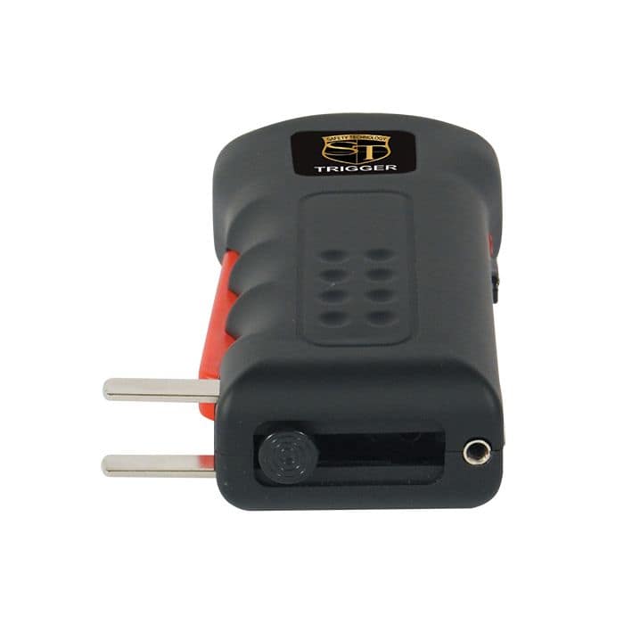 The Trigger 75,000,000 volt stun gun flashlight with wrist strap disable pin by Safety Technology has a unique trigger design for easy operation and lifetime warranty. With a quick pull of the trigger, you can have an attacker begging for mercy with these self defense weapons. The Trigger Stun Gun Flashlight has a rubberized coating to ensure a nice, tight grip. The super bright 100 lumen flashlight will blind any attacker, or it can be used as an everyday flashlight. The stopping power on the Safety Technology TRIGGER stun gun is excellent with 4.8 milliamps of electrical current to bring down the enemy. No need to keep track of another charger since the recharger prongs are built into each unit. The charge on the nickel-cadmium battery can last for up to 3 months depending on usage. The Trigger stun gun comes with a disabling pin wrist strap that is an added safety feature. With the strap around your wrist, if the stun gun were to be knocked out of your hand or taken away by a thug, it will be rendered useless.